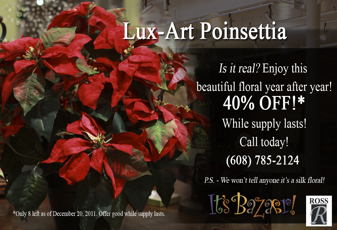 Deprecated: mysql_connect(): The mysql extension is deprecated and will be removed in the future: use mysqli or PDO instead in /home/rossecom/public_html/system/global.php on line 25 Lux-Art Poinsettia Offer : It's Bazaar : Ross Furniture : Ross Furniture and Interior DesignGoogle+